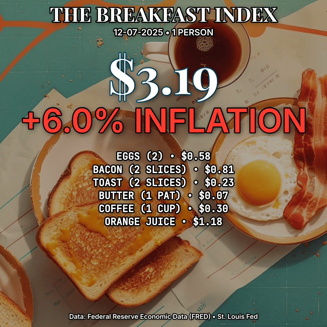 Why breakfast? Because it's universal. Almost everyone eats it. The items are simple and familiar: eggs, bacon, toast, butter, coffee, orange juice. You don't need an economics degree to understand what these things cost. You buy them every week. You feel the price changes in real time.